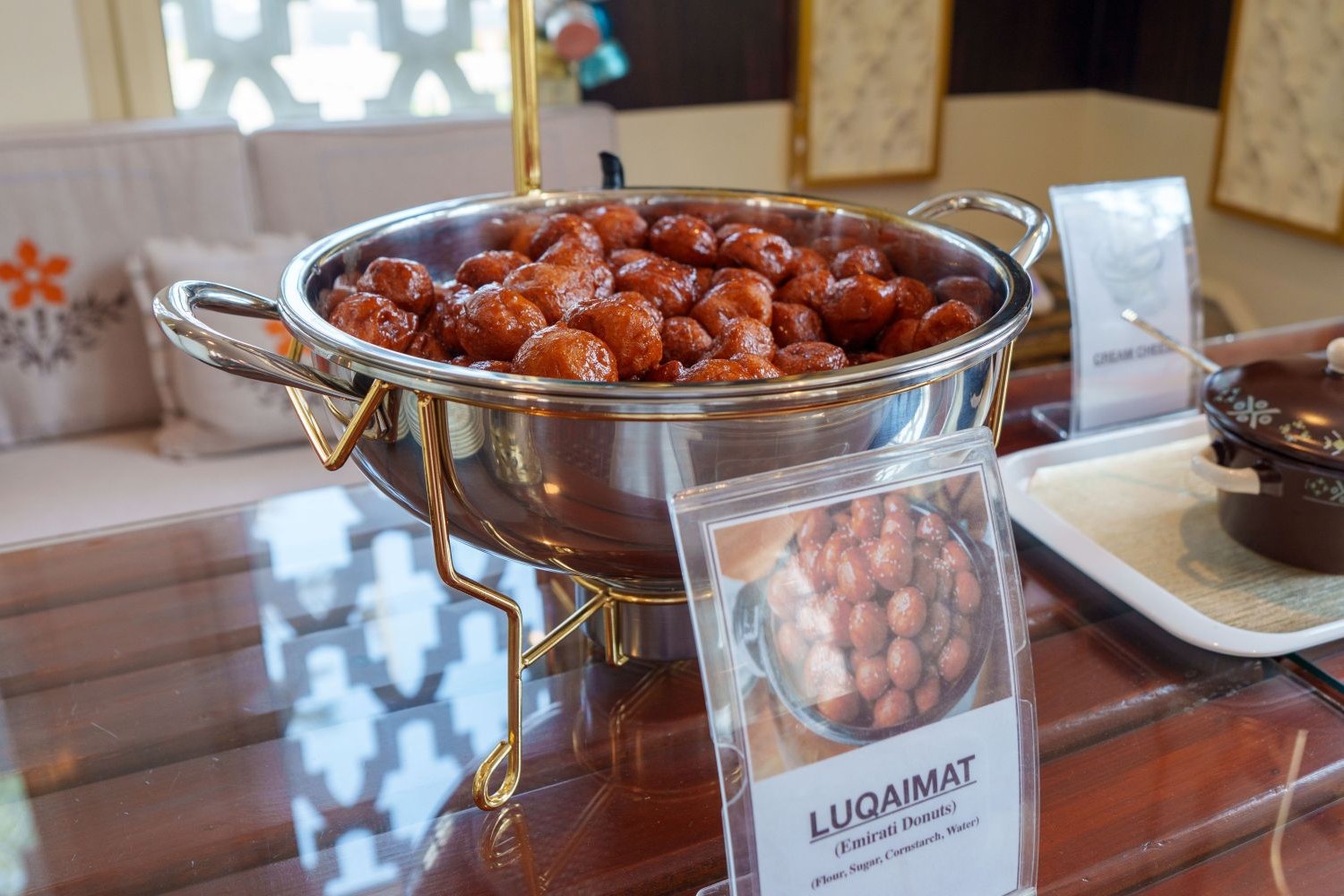 Offerings include traditional Arabic coffee, tea, dates, luqaimat (sweet dumplings), and water, all served in a setting that reflects Emirati hospitality.